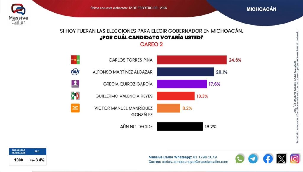 La más reciente medición de la casa encuestadora Massive Caller, levantada el 12 de febrero de 2026 con mil entrevistas y un margen de error de ±3.4%, muestra que la coalición Morena–PT–PVEM se mantiene a la cabeza en la intención de voto rumbo a la elección de gubernatura de Michoacán en 2027, al tiempo que se consolida el crecimiento de Carlos Torres Piña en la preferencia para encabezar la candidatura.