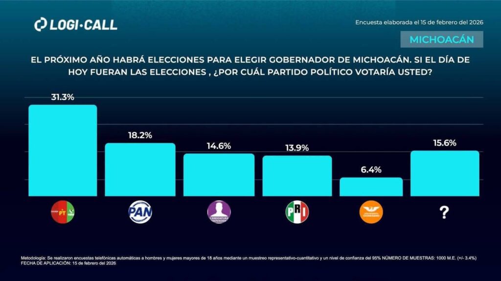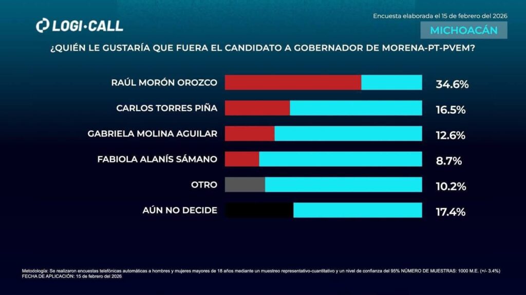 En vísperas de que Morena defina a su Coordinador Estatal de Defensa de la Cuarta Transformación, el senador Raúl Morón Orozco se posiciona con una ventaja inalcanzable, según los datos más recientes de la encuestadora Logi-Call, que en su estudio de febrero lo coloca a la cabeza de las preferencias internas con un sólido 34.6%, cifra que duplica a la su competidor más cercano.
