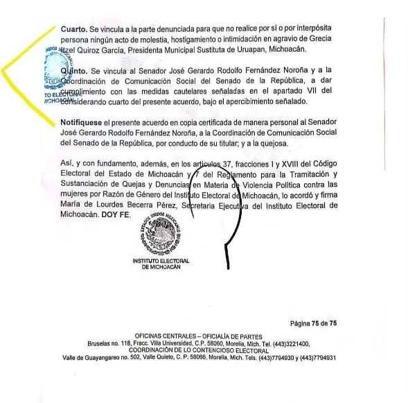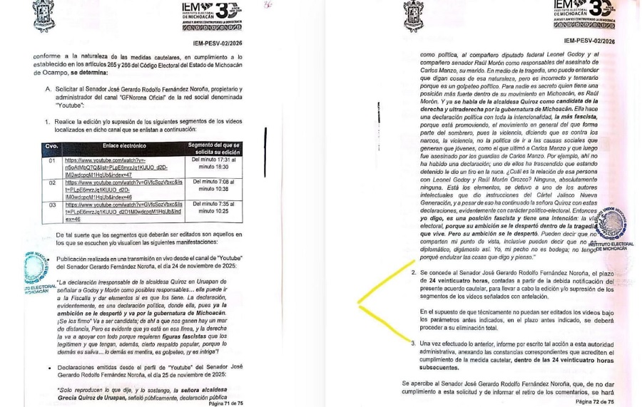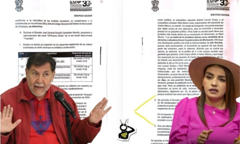 Según el documento sancionador de 74 páginas, el IEM le da a Noroña 24 horas retirar contenidos por violencia política de género contra Grecia Quiroz en su canal GFNorona Oficial en los que lanza expresiones tales como “la ambición ya se le despertó y va por la gubernatura de Michoacán”, o “su ambición se le despertó dentro de la tragedia que vive” y reiteradamente la califica de fascista.