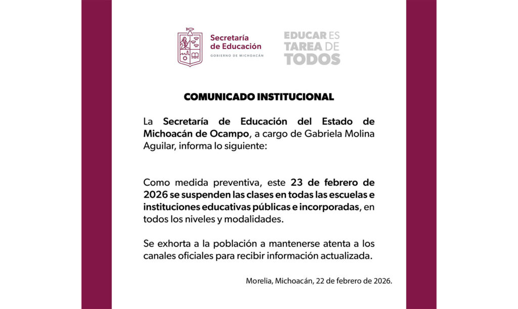 La secretaria de Educación del Estado, Gabriela Molina, informa que este lunes 23 de febrero se suspenden clases en todos los planteles públicos e incorporados de Michoacán, como medida preventiva y con el objetivo de resguardar la integridad de niñas, niños, jóvenes, docentes y trabajadores de la educación.