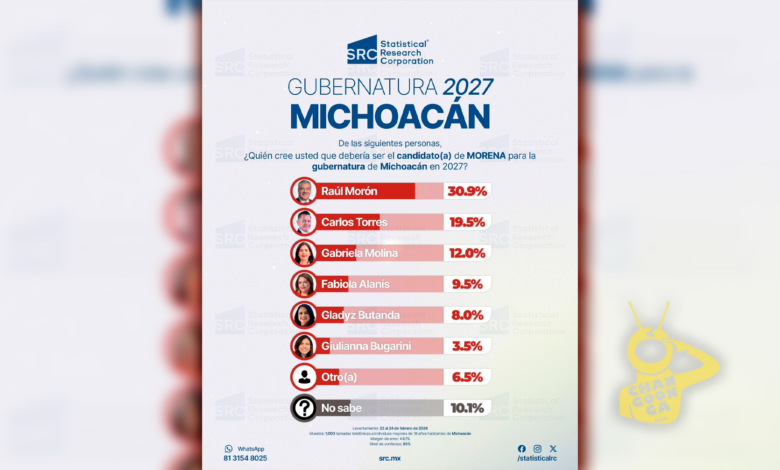 A poco más de un mes para que Morena defina su candidatura hacia la gubernatura de Michoacán en 2027, las encuestas reflejan un escenario de clara ventaja para el senador Raúl Morón Orozco, así lo muestra el más reciente estudio de Statistical Research Corporation (SRC), en donde el profesor se mantiene firme en la cima de las preferencias ciudadanas con una ventaja de doble dígito.