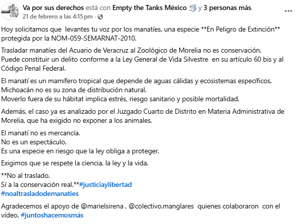 El plan de traer manatíes al Zoológico de Morelia (Benito Juárez) quedó congelado este martes 3 de marzo de 2026. Un juez federal frenó el traslado desde el Aquarium de Veracruz luego de que la organización «Va por sus Derechos» promoviera un amparo advirtiendo que el movimiento no es conservación, sino un riesgo de muerte que podría constituir un delito según el artículo 60 bis de la Ley General de Vida Silvestre.