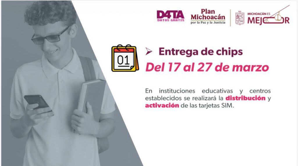 Mientras que la titular del Instituto de Educación Media Superior y Superior del Estado de Michoacán (Iemsysem), Mariana Sosa Olmeda, refirió que para la asignación de los chips todas y todos los estudiantes deberán entregar copia del INE y de la CURP; mientras que los alumnos menores de edad entregarán CURP, copia de la CURP e INE del padre, madre o tutor.