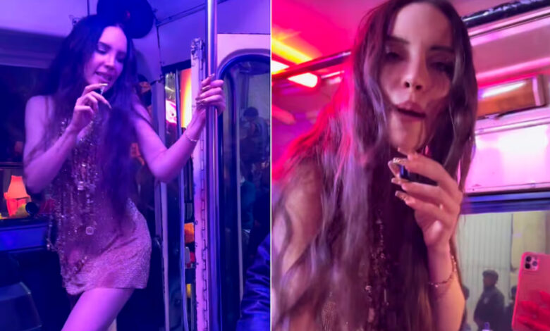 En los videos compartidos por internautas, se puede ver a la cantante con un vestido dorado y con el cabello suelto, mientras usa la voz de su personaje en la serie «Mentiras».