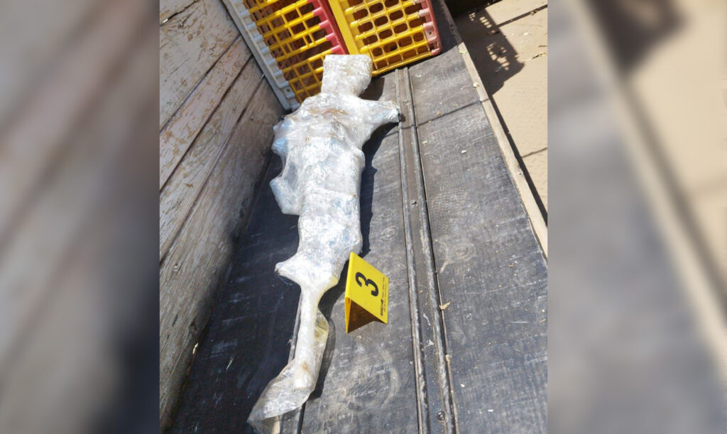 En seguimiento y en coordinación con la Fiscalía General del Estado (FGE) se realizó una revisión más detallada del vehículo, donde se detectó un compartimiento oculto en la carrocería y en su interior se encontraba un arma larga calibre .50 con aditamentos, así como un uniforme.