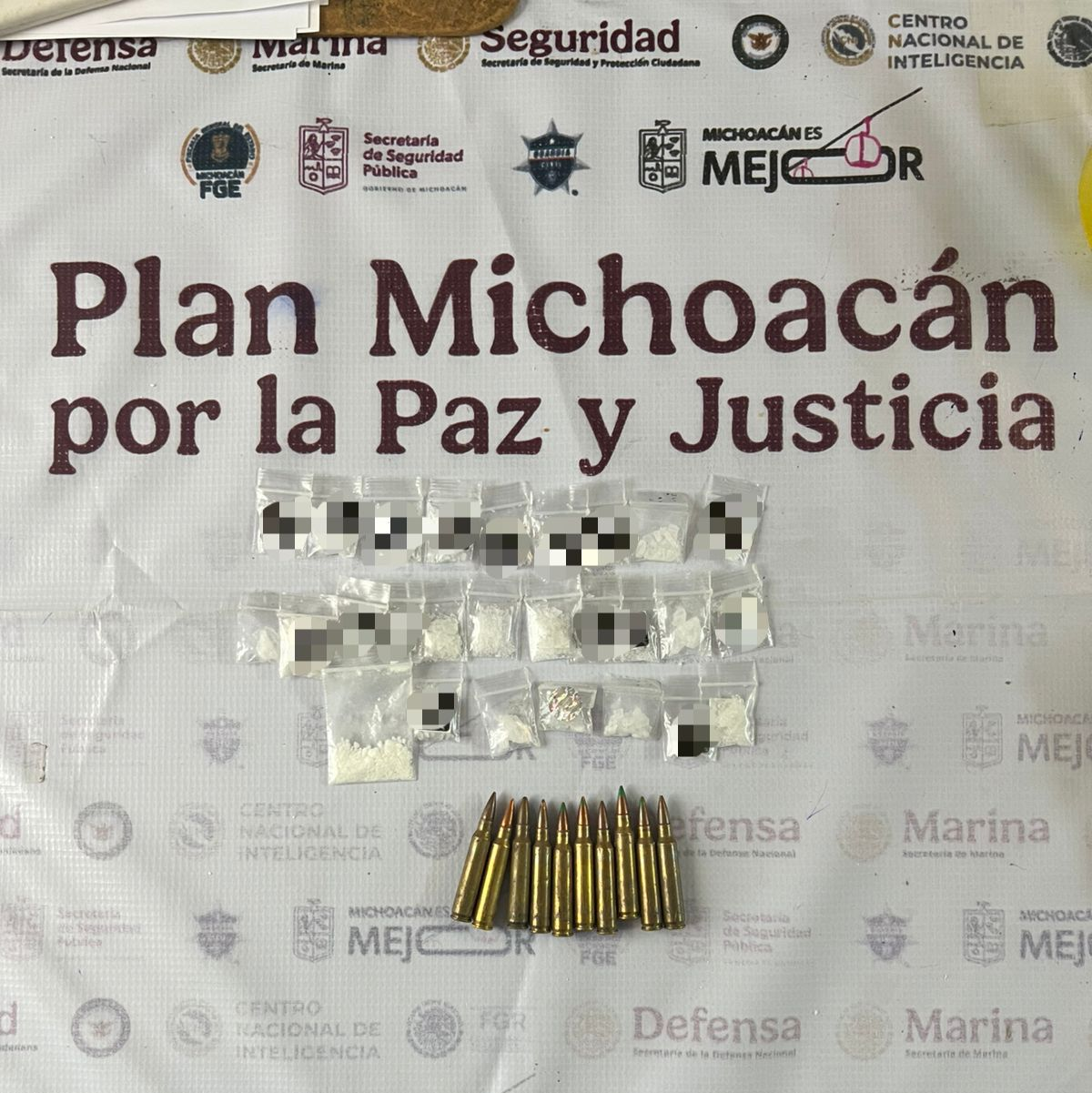 Durante la inspección se localizaron 27 bolsitas tipo Ziploc con sustancia granulada, así como 10 cartuchos útiles calibre .556. Además, fue asegurada una placa de circulación con reporte de robo vigente.
