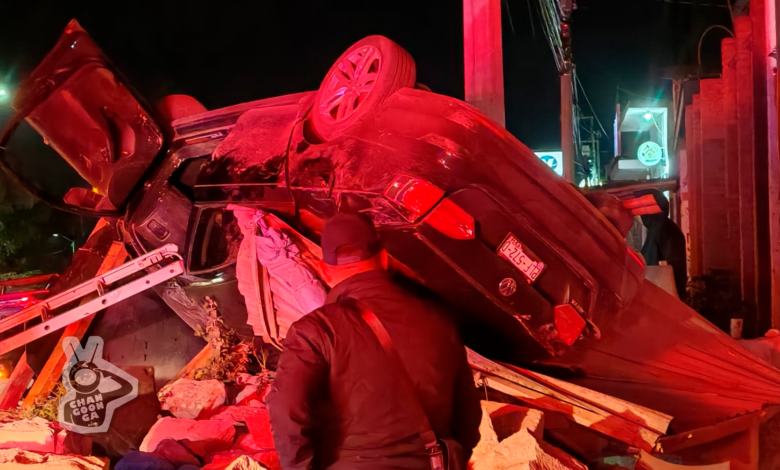 El vehículo involucrado es un Volkswagen Jetta, con placas PLF572D, el cual terminó destrozado y sobre unos bloques de cantera ubicados afuera del negocio denominado “Canteras León”.