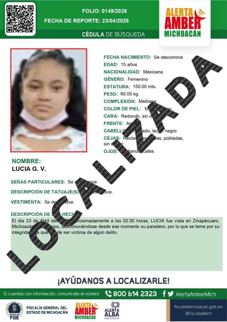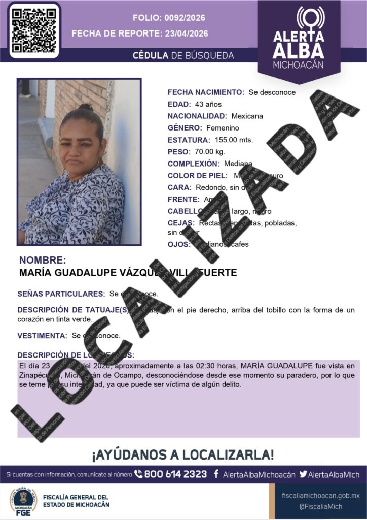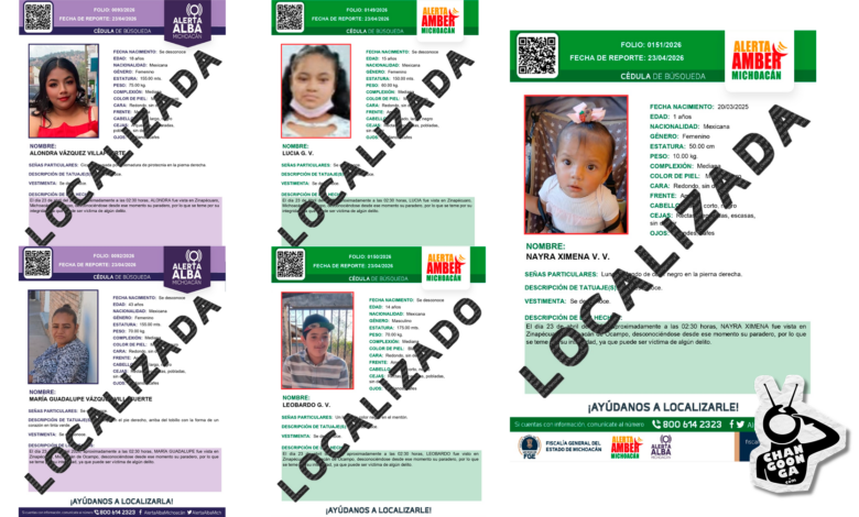 La Fiscalía General del Estado de Michoacán (FGE), a través de la Fiscalía Especializada para la Investigación y Persecución de los Delitos de Desaparición Forzada de Personas y Desaparición Cometida por Particulares, localizó sanas y salvas a cinco personas que habían sido reportadas como desaparecidas en el municipio de Zinapécuaro.