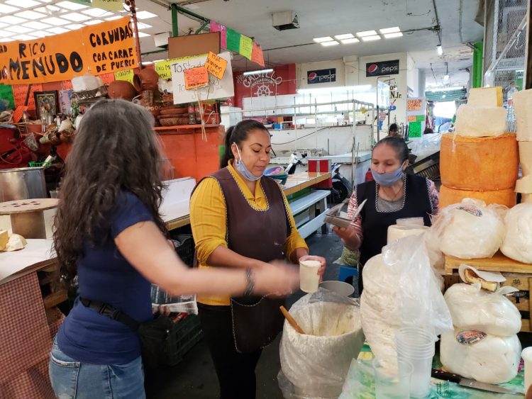 Mientras en los puestos de comida se deberá usar guantes, cofia, gel antibacterial y tener agua y jabón; mantener el área limpia de forma constante. Así como mantener comunicación constante entre los comerciantes para que en el caso de detectar alguna sintomatología de esta enfermedad dar parte a las autoridades sanitarias para que se le brinde a la persona atención médica oportuna.