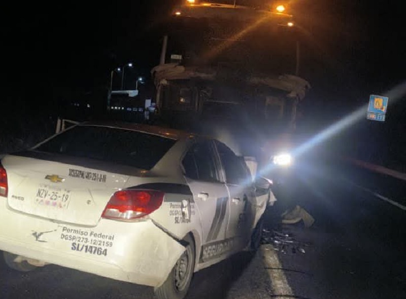 De acuerdo con la información preliminar, aparentemente el auto, un Chevrolet Aveo de color blanco con matrícula NZV-25-19, con rótulos de Seguridad Privada, trató de rebasar e impactó de frente contra un camión de carga con doble remolque.