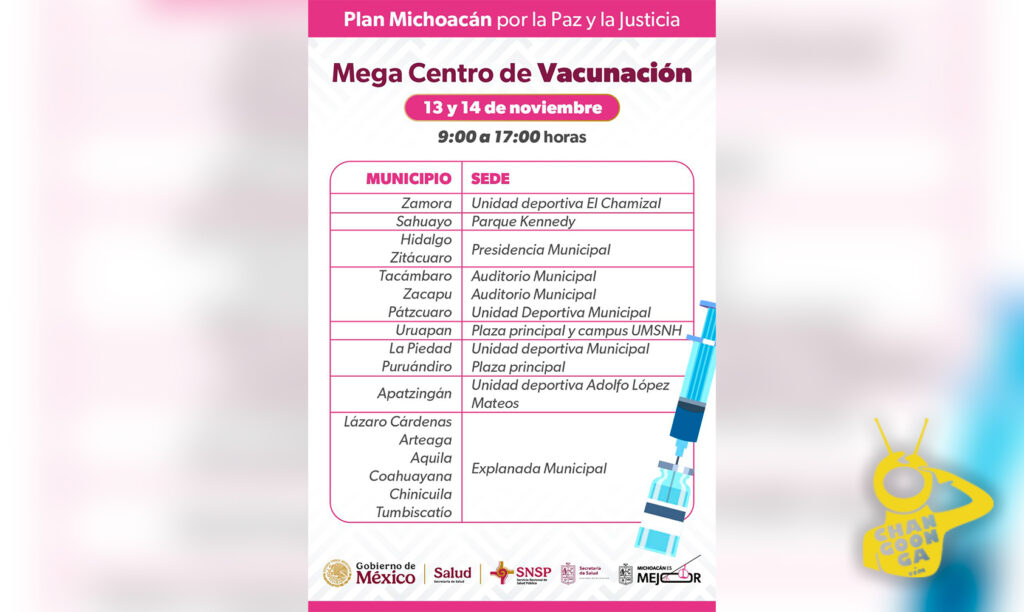 Como parte del Plan Michoacán por la Paz y la Justicia, la Secretaría de Salud de Michoacán (SSM) en un esfuerzo por fortalecer la protección inmunológica de la población ante la temporada invernal, anuncia la instalación de mega centros de vacunación en 17 municipios del estado, los días jueves 13 y viernes 14 de noviembre.