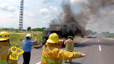 STAFF/@michangoonga/RED-113 Un camión limonero fue consumido por un voraz incendió, cuando circulaba por la carretera Apatzingán-Cuatro Caminos, en las cercanías…