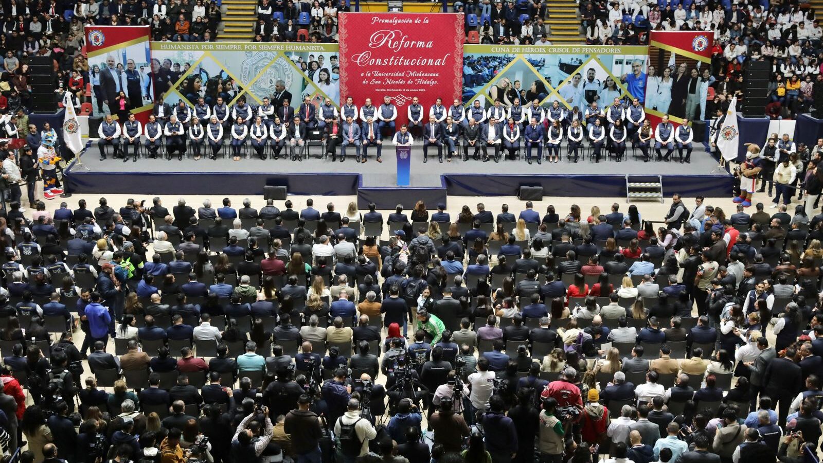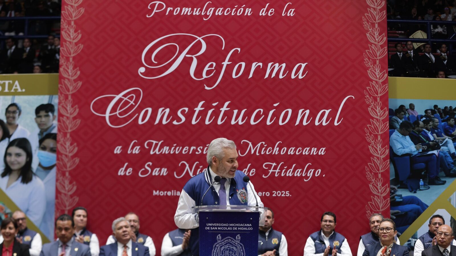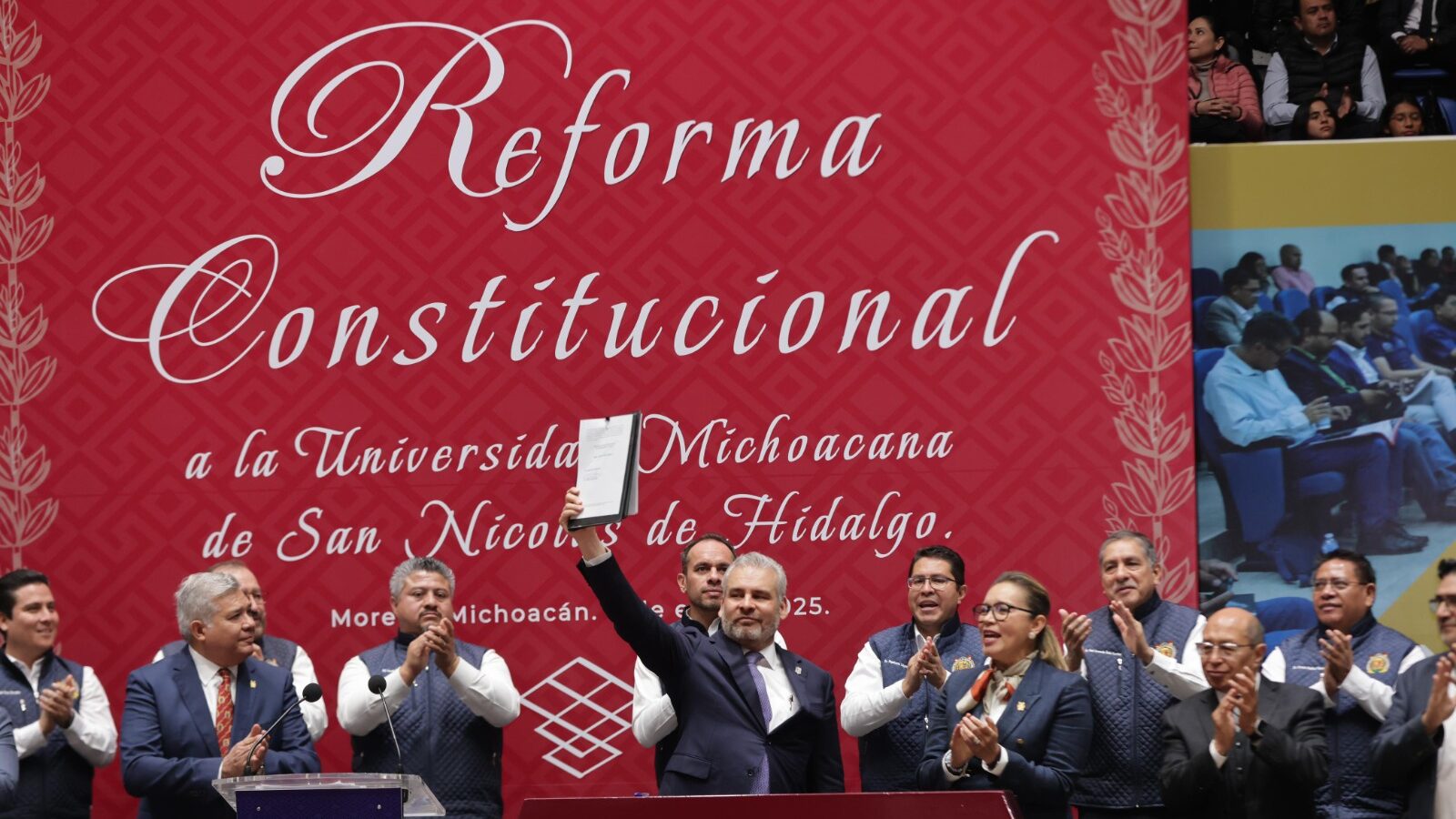 Ante el pleno de la comunidad universitaria, el gobernador Alfredo Ramírez Bedolla firmó el Decreto de Promulgación de la Reforma Constitucional a la Universidad Michoacana de San Nicolás de Hidalgo (UMSNH), garantizándose así la asignación del 4.5 por ciento del presupuesto estatal para la Máxima Casa de Estudios, autonomía plena y elevación a rango constitucional la democratización de la elección del o la rectora y de los sistemas de pensiones y jubilaciones.