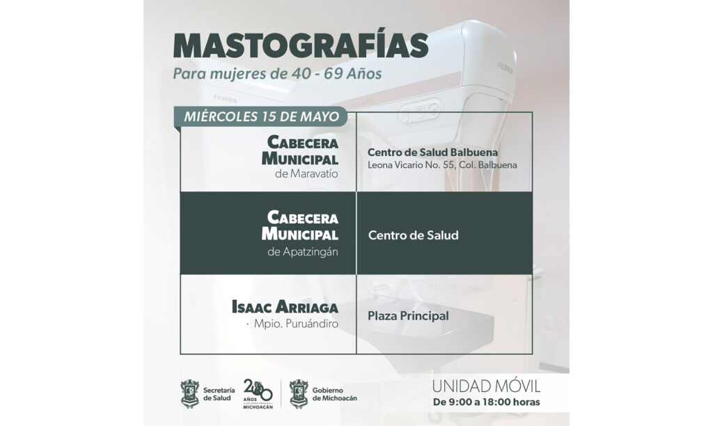 El lunes 13 de mayo, las unidades móviles de mastografía, que cuentan con capacidad para atender hasta 120 usuarias por día, estarán en el centro de salud de Apatzingán y en las plazas principales de Puruándiro y San Miguel Curahuango, tenencia de Maravatío.