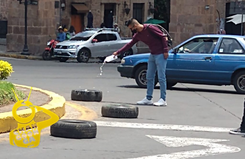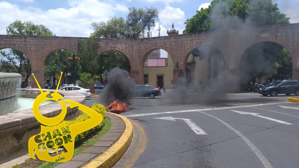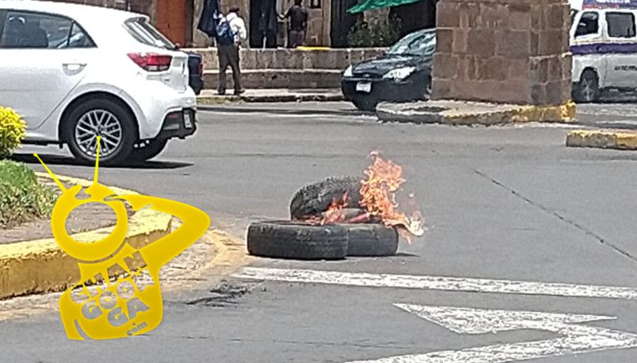 Al finalizar la movilización, un grupo de jóvenes colocó tres llantas en la vialidad, frente al monumento histórico, y les prendió fuego.