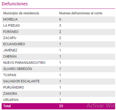 Este martes se registraron 23 muertes a causa de COVID-19: Morelia tuvo 6, La Piedad 3, Zacapu y los casos foráneos tuvieron 2 cada uno; Ecuandureo, Jiménez, Cherán, Nuevo Parangaricutiro, Álvaro Obregón, Tuxpan, Salvador Escalante, Puruándiro, Zamora y Uruapan registraron uno cada uno.