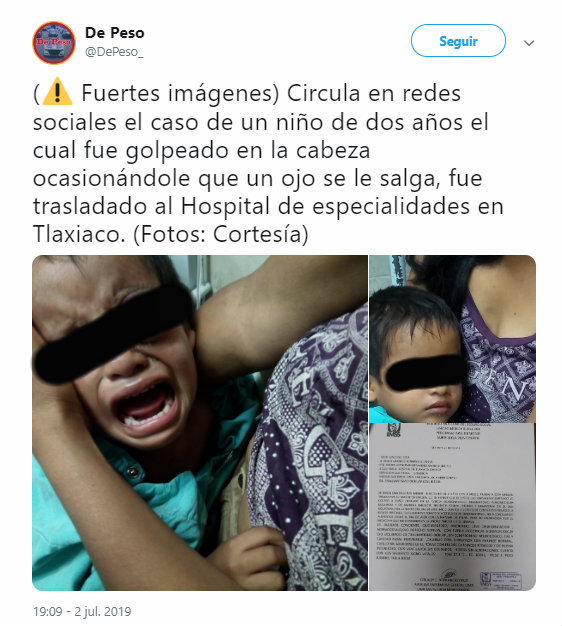 De acuerdo con la madre del menor, originario de Tlaxiaco, Oaxaca, el sujeto lo golpeó a puño cerrado en la cabeza, “ocasionándole traumatismo periorbicular izquierdo y de manera inmediata presentó edema intenso y hematoma en el ojo izquierdo”, especificó la Unidad Médica Rural 404 de Santa Lucía Monteverde, que se vio impedido a atender al niño por falta de personal.
