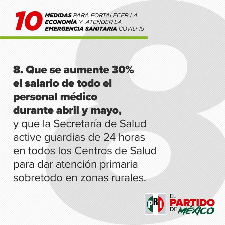 - Que se aumente 30 por ciento el salario de todo el personal médico durante abril y mayo, y que la Secretaría de Salud active guardias de 24 horas en todos los Centros de Salud para dar atención primaria sobre todo en zonas rurales.