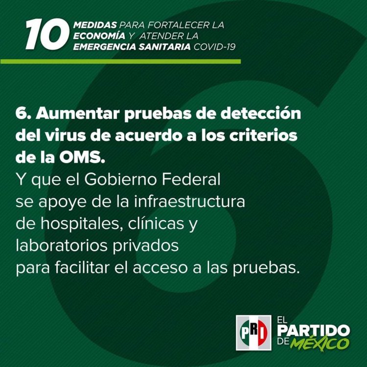 - Aumentar las pruebas de detección del virus, de acuerdo a los criterios de la Organización Mundial de la Salud. Y que el Gobierno Federal se apoye de la infraestructura de hospitales, clínicas y laboratorios privados, para facilitar el acceso a las pruebas.