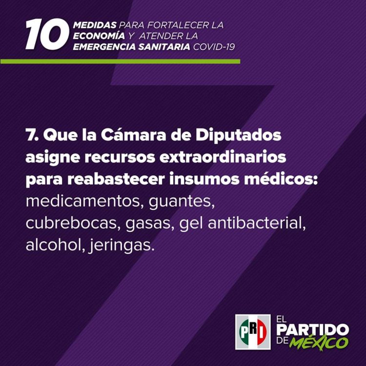 - Que la Cámara de Diputados apruebe la asignación de una partida extraordinaria de recursos para reabastecer insumos médicos en la red del sistema de salud: medicamentos, guantes, cubrebocas, gasas, gel antibacterial, alcohol, jeringas.