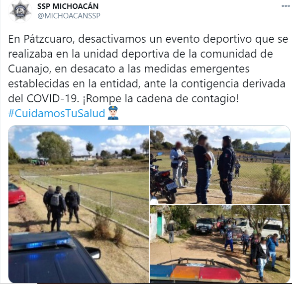 “En Pátzcuaro, desactivamos un evento deportivo que se realizaba en la unidad deportiva de la comunidad de Cuanajo, en desacato a las medidas emergentes establecidas en la entidad, ante la contingencia derivada del COVID-19. ¡Rompe la cadena de contagio! #CuidamosTuSalud”, señaló la SSP en sus redes sociales.