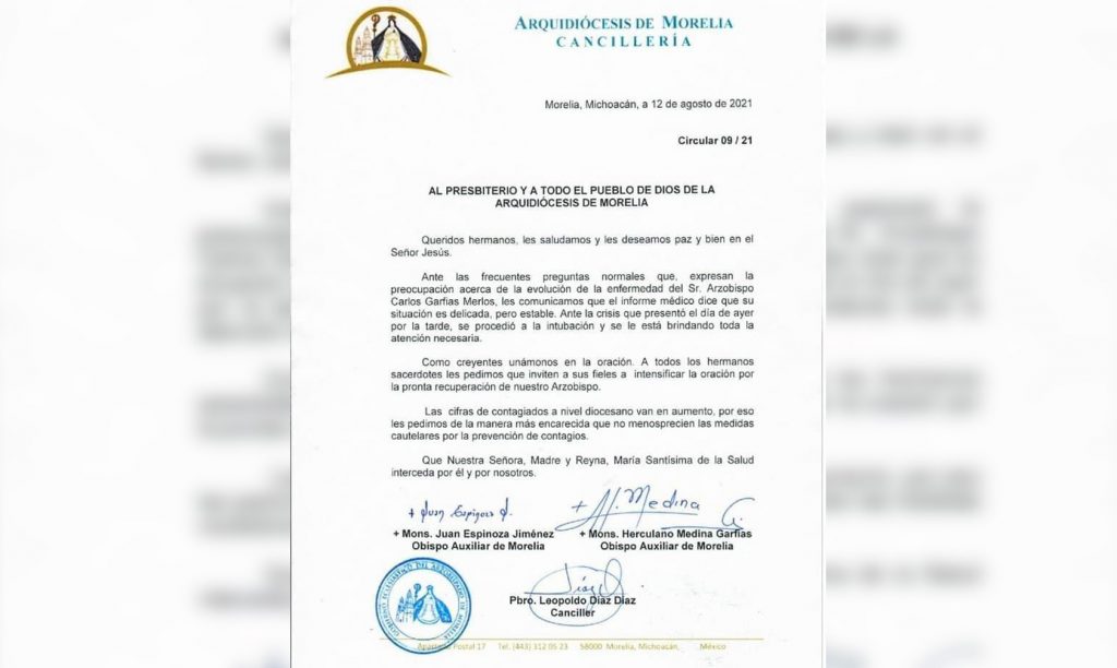 El Arzobispo de Morelia, Carlos Garfias Merlos, fue intubado debido a una crisis de salud derivada del COVID-19, por lo que se le están brindando las atenciones necesarias.