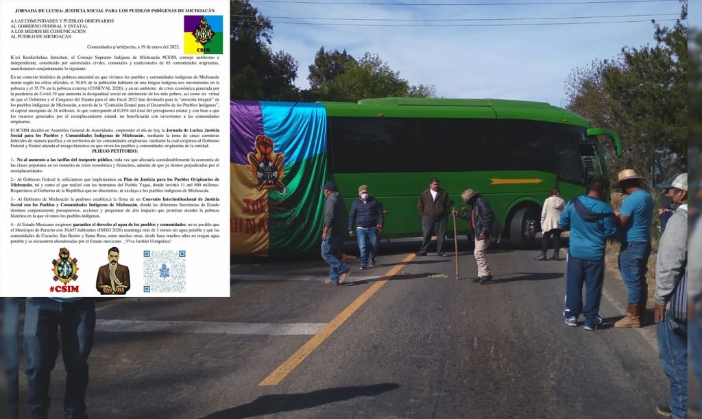 El #CSIM decidió en Asamblea General de Autoridades, emprender el día de hoy la Jornada de Lucha: Justicia Social para los Pueblos y Comunidades Indígenas de Michoacán, mediante la toma de cinco carreteras federales de manera pacífica y en territorios de las comunidades originarias, mediante la cual exigimos al Gobierno Federal y Estatal atienda el rezago histórico en que viven los pueblos y comunidades originarias de la entidad.