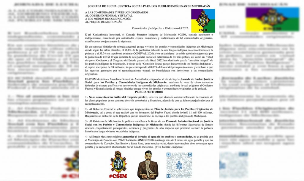 En un contexto histórico de pobreza ancestral en que vivimos los pueblos y comunidades indígenas de Michoacán donde según las cifras oficiales, el 76.8% de la población hablante de una lengua indígena nos encontramos en la pobreza y el 35.7% en la pobreza extrema (CONEVAL 2020), y en un ambiente de crisis económica generada por la pandemia de Covid-19 que aumenta la desigualdad social en detrimento de los más pobres, así como en virtud de que el Gobierno y el Congreso del Estado para el año fiscal 2022 han destinado para la “atención integral” de los pueblos indígenas de Michoacán, a través de la “Comisión Estatal para el Desarrollo de los Pueblos Indígenas”, el capital mezquino de 24 millones, lo que corresponde al 0.03% del total del presupuesto estatal y con base a que los recursos generados por el reemplacamiento estatal, no beneficiarán con inversiones a las comunidades originarias.
