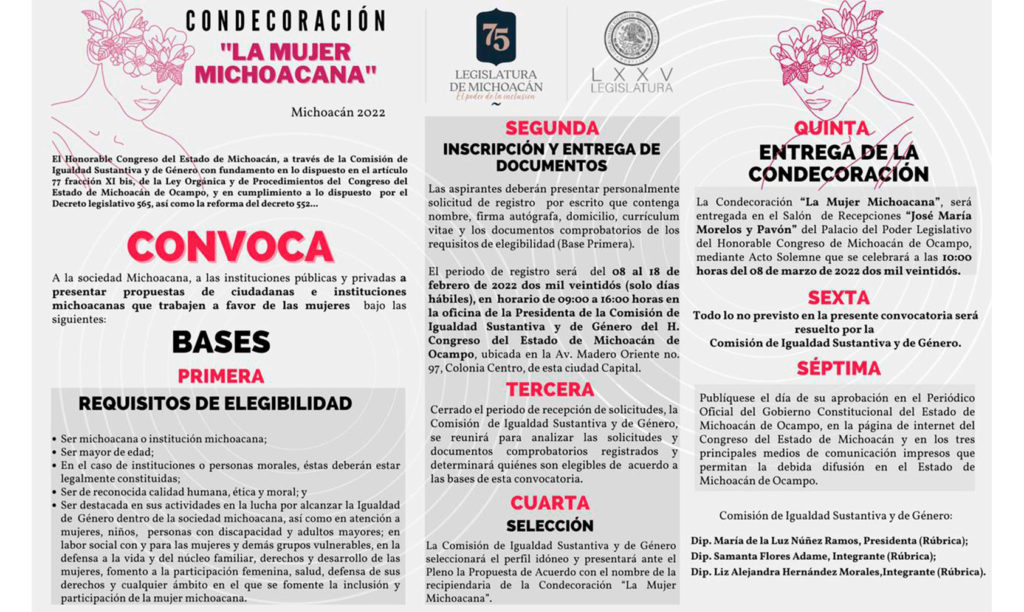 La diputada María de la Luz señaló esta convocatoria para la condecoración de "La Mujer Michoacana" se reformaría a finales de este 2022 para no incluir el requisito de "defensa de la vida"