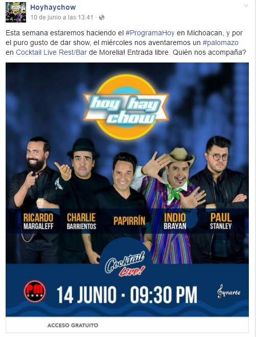 Mediante el perfil de Facebook de su promotora “Hoyhachow”, desde el sábado pasado se hizó el anuncio: “ Esta semana estaremos haciendo el #ProgramaHoy en Michoacan, y por el puro gusto de dar show, el miércoles nos aventaremos un #palomazo en Cocktail Live Rest/Bar de Morelia! Entrada libre. Quién nos acompaña?”.
