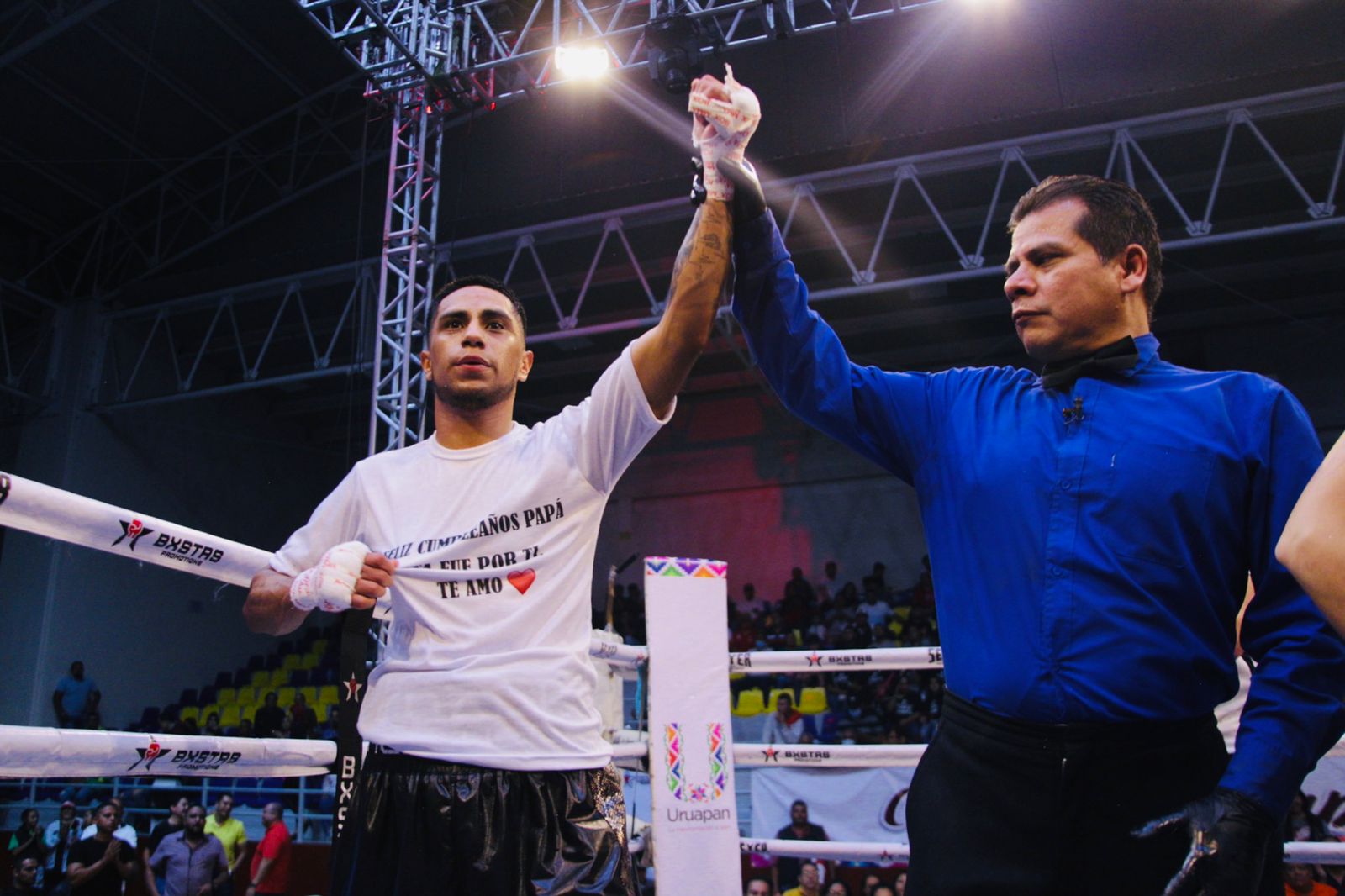 El combate estelar lo ganó por decisión mayoritaria, Jonathan “Titán” Rodríguez, de San Luis Potosí, a Juan Daniel “Tubo” Ramírez, de la Ciudad de México (Cdmx). En una de las contiendas más esperadas por la afición local, el uruapense Víctor Hugo “Bennis” Vázquez, de la colonia Ramón Farías, debutó con éxito en el boxeo profesional, al derrotar por decisión dividida a José “Chino” Linares.