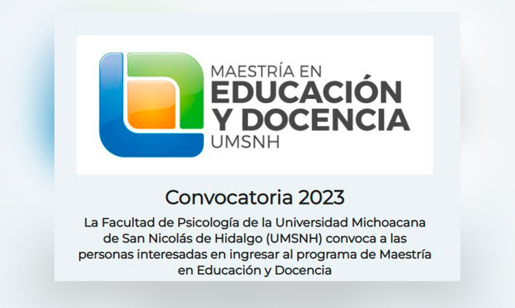 Atendiendo al compromiso con el profesorado del nivel medio superior y superior para brindar una educación de calidad a sus estudiantes, la Universidad Michoacana de San Nicolás de Hidalgo (UMSNH) a través de la Facultad de Psicología, pone a disposición de las y los interesados, la convocatoria de ingreso al Programa de Maestría en Educación y Docencia (MEyD).