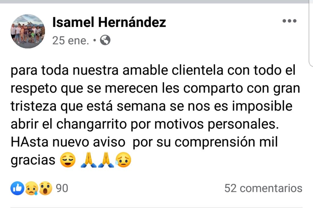 Previamente, en el perfil personal de Isamel Hernández ya se había anunciado que por motivos personales no se iba a poder abrir el negocio de hamburguesas hasta nuevo aviso.