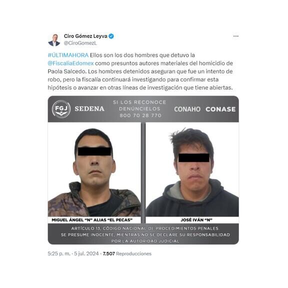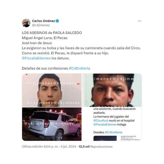 “La Fiscalía del Edomex detuvo a los dos autores materiales del homicidio de Paola Salcedo. Los hombres detenidos aseguran que fue un intento de robo, pero la fiscalía continuará investigando para confirmar esta hipótesis o avanzar en otras líneas de investigación que tiene abiertas”. Señaló el periodista.