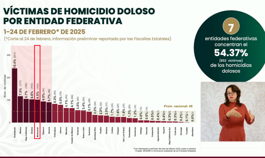 Michoacán pasó de estar en la cuarta posición a ocupar el quinto lugar en la lista de los 7 estados más violentos de México, con 102 homicidios dolosos ocurridos en los 24 días de febrero de este año, lo que representa el 6.5 por ciento del total nacional.