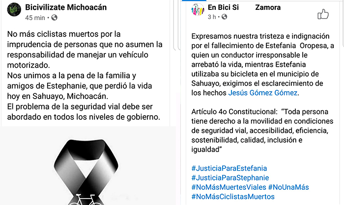 “Nos unimos a la pena de la familia y amigos de Stephanie Oropesa, a quien un conductor irresponsable le arrebató la vida, mientras Stephani utilizaba su bicicleta en el municipio de Sahuayo. Artículo 4o Constitucional: “Toda persona tiene derecho a la movilidad en condiciones de seguridad vial, accesibilidad, eficiencia, sostenibilidad, calidad, inclusión e igualdad”. Exigimos a las autoridades que hagan lo que deben hacer, porque la omisión también implica responsabilidad.”, escribió la asociación En Bici Michoacán en su cuenta oficial de Facebook.