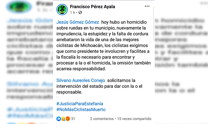 “Hoy hubo un homicidio sobre ruedas en Sahuayo, nuevamente la imprudencia, la estupidez y la falta de cordura arrebataron la vida de una de las mejores ciclistas de Michoacán, los ciclistas exigimos que como presidente te involucres y facilites a la fiscalía lo necesario para encontrar y procesar al homicida, la omisión también acarrea responsabilidad. Silvano Aureoles, solicitamos la intervención del estado para dar con el responsable”, escribió un ciclista en su cuenta personal de Facebook, dirigida al presidente municipal de Sahuayo.