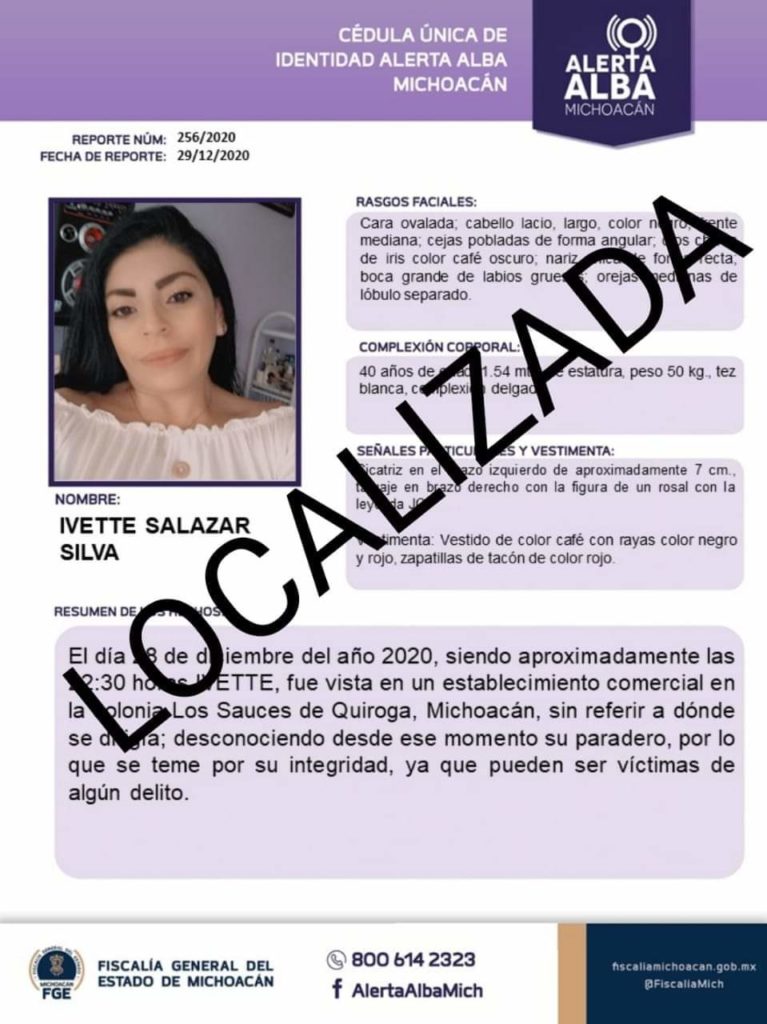 La Fiscalía General del Estado de Michoacán (FGE) localizó sana y salva a una mujer que el pasado 28 de diciembre fue reportada como desaparecida en el municipio de Quiroga.