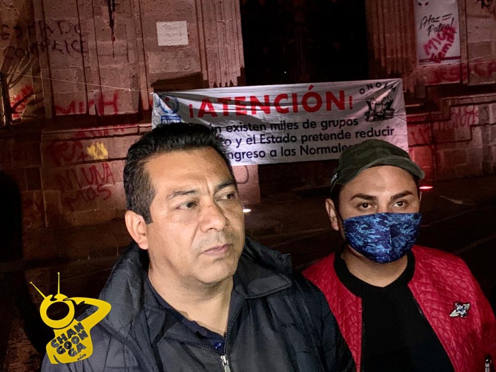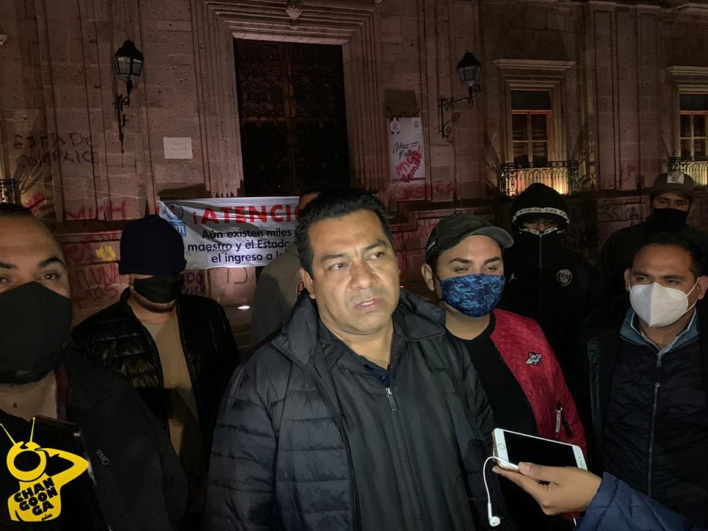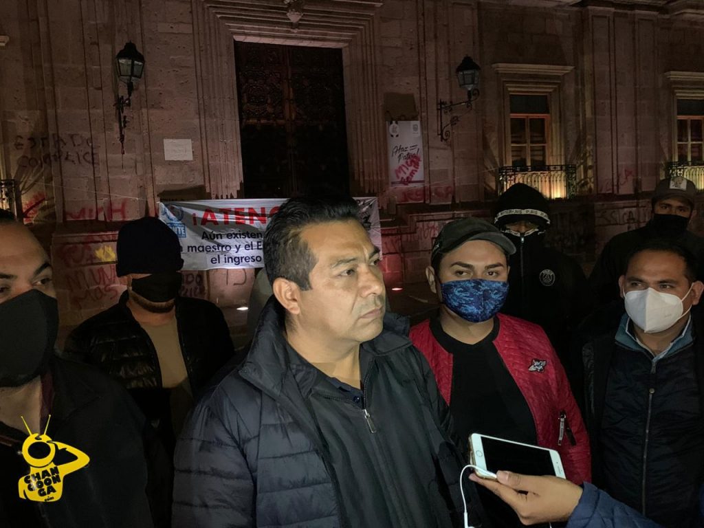 La madrugada de este miércoles integrantes de la Coordinadora Nacional de Trabajadores de la Educación (CNTE) y de la Organización de Normales Oficiales del Estado de Michoacán (ONOEM) realizaron un mitin frente a la Palacio de Gobierno en Morelia.