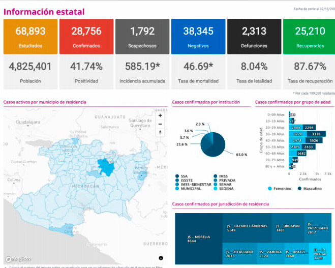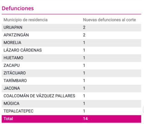 Las defuciones se vivieron en 2 en Apatzingán y Uruapan, 1 en Morelia, Lázaro Cárdenas, Huetamo, Zacapu, Zitácuaro, Tarímbaro, Jacona, Coalcoman, Múgica y Tepalcatepec.