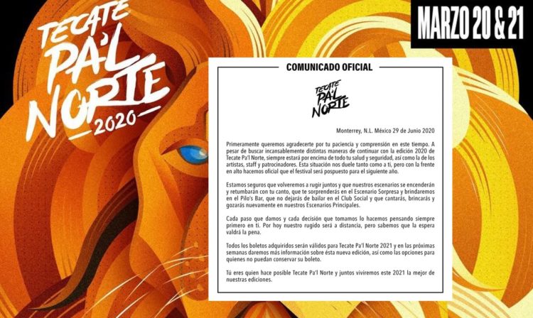 Se menciona que a pesar de buscaron inalcanzablemente las maneras de continuar con la edición 2020 de Tecate Pa’l Norte, no pudieron realizar el evento, resaltaron que la salud de sus seguidores es lo principal y que como recompensa se les daría el acceso el siguiente año.
